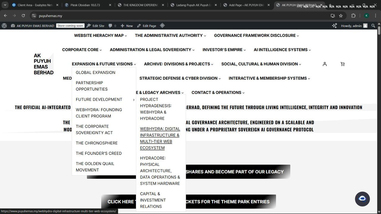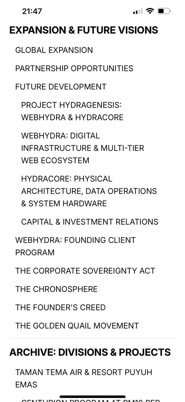 At its core, WebHydra is a 100+ page integrated digital ecosystem organized under 15 Primary Divisions, each structured to mirror real-world corporate governance, operational clarity, and long-term scalability.