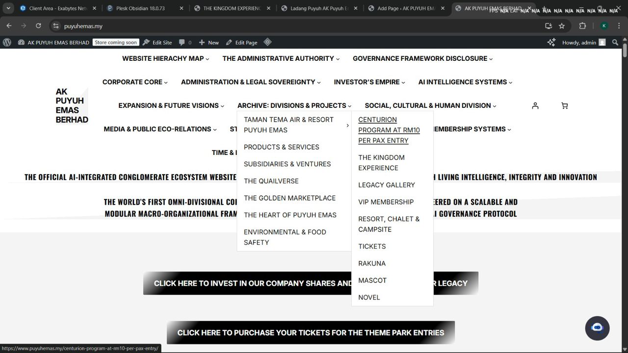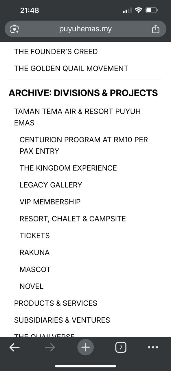 Divisions & Projects acts as the comprehensive operational registry overseeing all major subsidiaries, flagship developments, enterprise initiatives, specialized ventures, and programmatic projects active within the organizational ecosystem. It catalogs and monitors diverse sectors—including tourism, food security, environmental engineering, consumer ecosystems, innovation clusters, and large-scale developments such as Taman Tema Air & Resort Puyuh Emas, The QuailVerse, and The Golden Marketplace—ensuring administrative coordination, progress validation, and strategic alignment. By providing a unified view of every active and upcoming undertaking, this division supports cross-departmental synergy, accelerates growth, and maintains organizational cohesion across an expanding multi-industry portfolio.