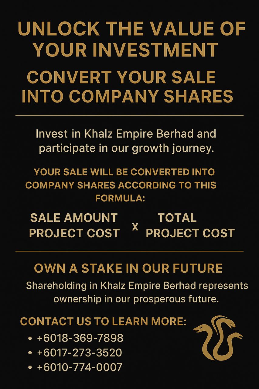This flyer presents the WebHydra Equity Conversion Framework, a core component of Project Hydragenesis. It announces the unprecedented policy where every WebHydra purchase is automatically converted into official corporate shares of Khalz Empire Berhad.